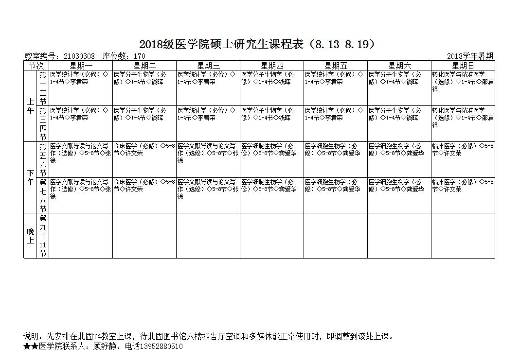 因天气炎热,在北固图书馆六楼报告厅空调和多媒体未能正常使用前,本课表之课程全部调至门诊五楼北教室上课。