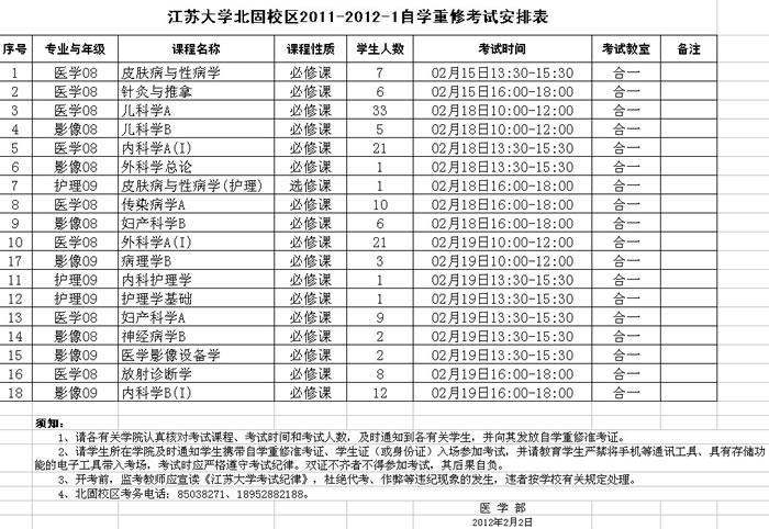 北固校区2011-2012学年第一学期自学重修考试日程安排