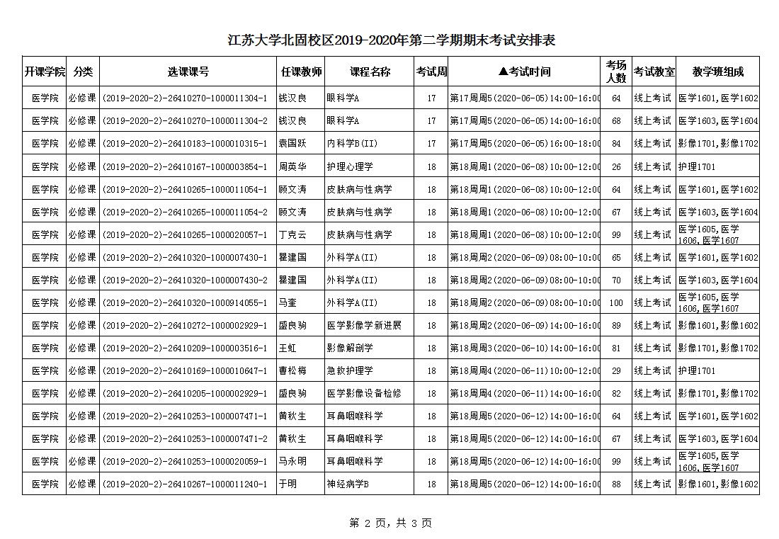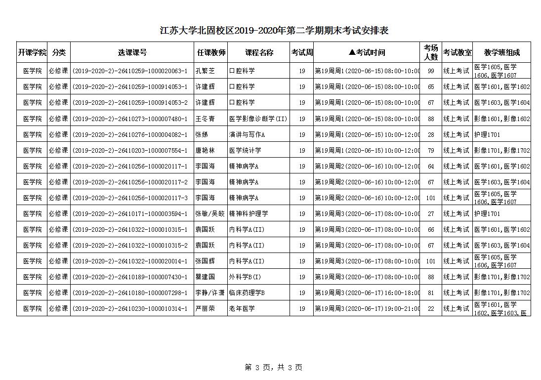 北固校区2019-2020学年第二学期期末考试安排